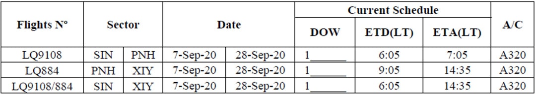 From 7th Sep 2020, Lanmei Airlines Cambodia (LQ) will have direct flights from Singapore Changi Airport to Phnom Penh International Airport (SIN-PNH) and flights from Singapore Changi Airport to Xi’an Xianyang International (SIN-XIY) (Transit at PNH).